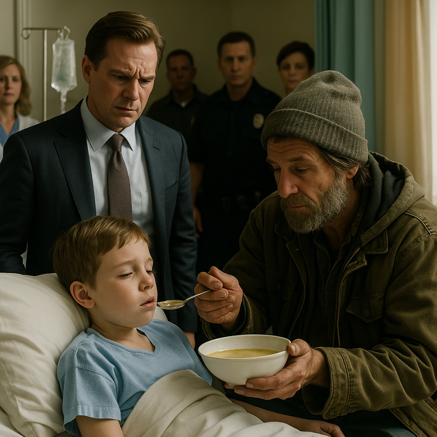 Esteban, entre la desesperación y el orgullo, aceptó a regañadientes. Ordenó que lo dejaran pasar, dispuesto a demostrar que todo era una farsa. El mendigo pidió algo sencillo: sopa casera, pan recién hecho y fruta fresca. Mientras comía, miraba con calma el cuarto donde el niño dormía conectado a sondas y monitores.