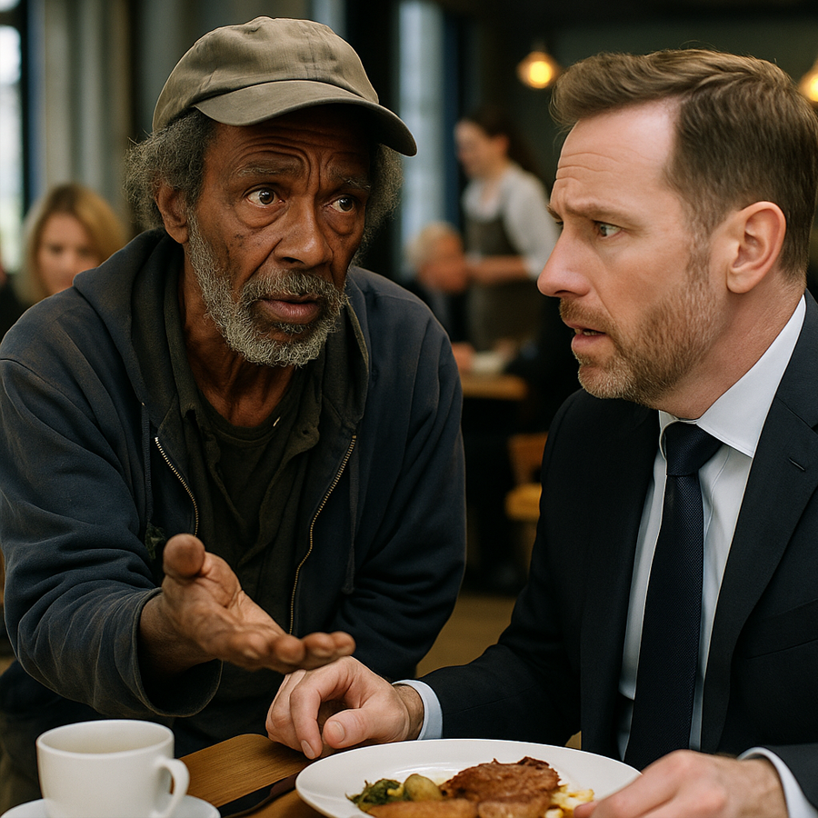 Ese día, mientras reía con un grupo de inversores, algo interrumpió su comodidad: un hombre sin hogar, delgado, de barba canosa y mirada cansada, se acercó al ventanal del restaurante. Afuera, el frío del invierno calaba los huesos, y sus manos temblaban bajo un abrigo raído.