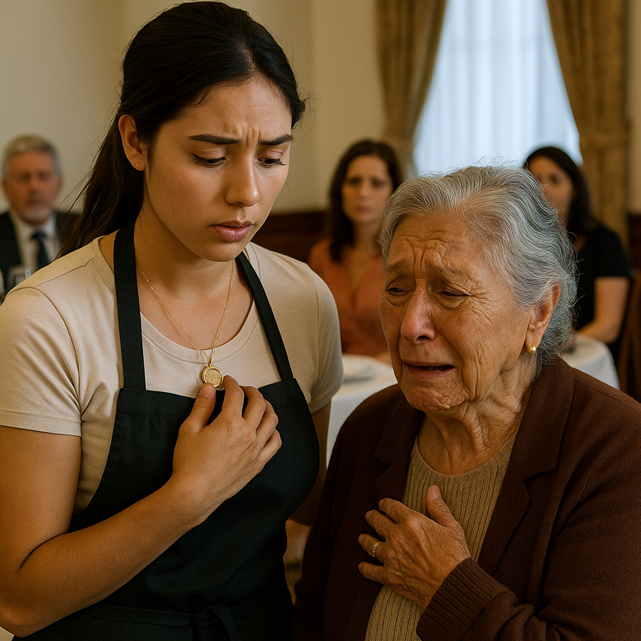 Mientras servía el postre, Ana se inclinó para dejar una copa de vino frente a Doña Mercedes. Fue entonces cuando la anciana vio algo que la paralizó: un collar dorado, sencillo pero inconfundible, colgaba del cuello de la camarera.