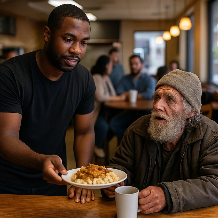 En un modesto restaurante del sur de Estados Unidos, donde el aroma a pan recién horneado y guisos caseros llena el aire, ocurrió un suceso que nadie esperaba. Marcus Brown, un joven afroamericano dueño del local, acostumbrado a luchar cada día por mantener su pequeño negocio a flote, realizó un acto de compasión que parecía insignificante: ofrecer un plato de comida caliente a un hombre sin hogar. Sin embargo, aquel gesto marcaría un antes y un después en su vida.