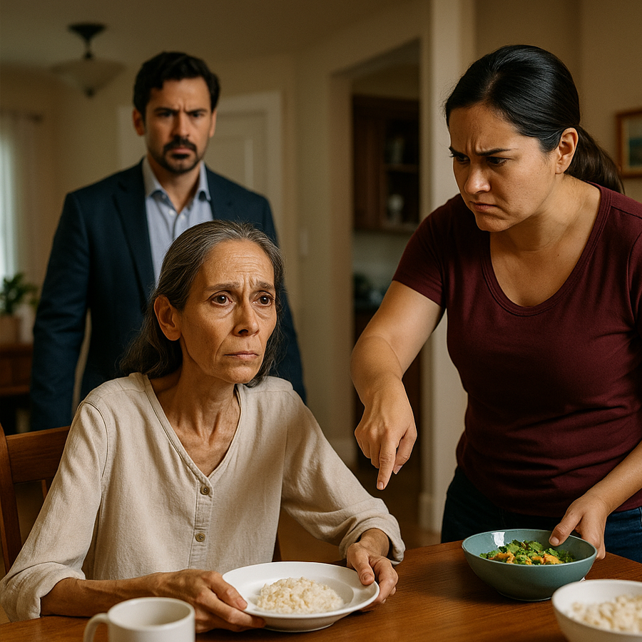 Su esposa le servía a su madre un plato diminuto con arroz frío y una taza de agua, mientras ella misma comía un filete y una ensalada fresca. La mujer mayor, demacrada, apenas sostenía la cuchara. Mariana, en cambio, la observaba con una mezcla de impaciencia y desprecio.
