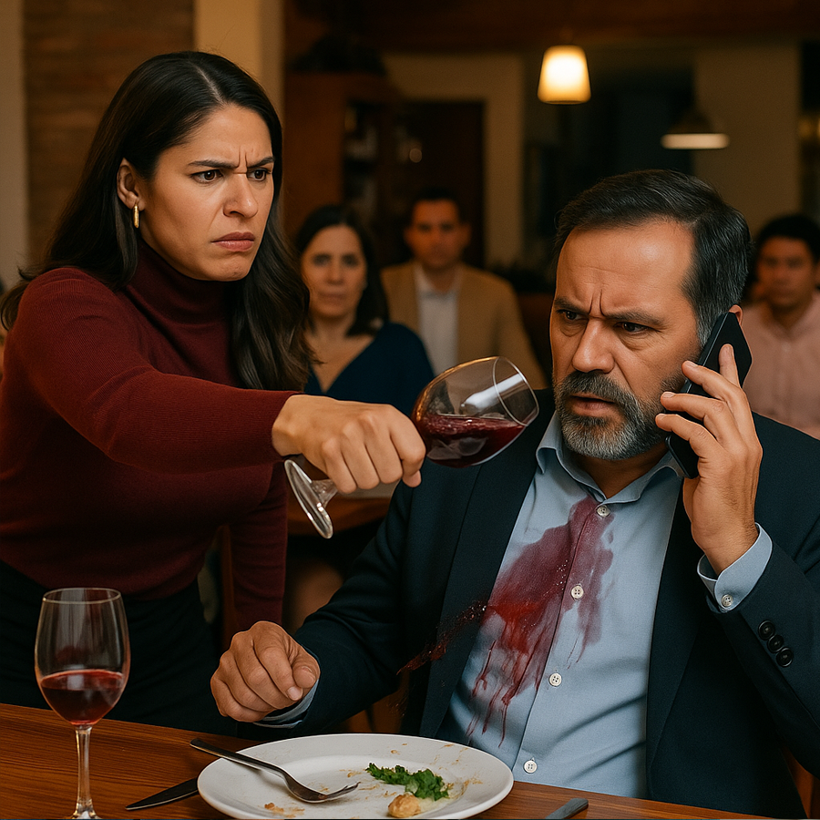 Luis se quedó quieto, el vino escurriendo por su camisa blanca.