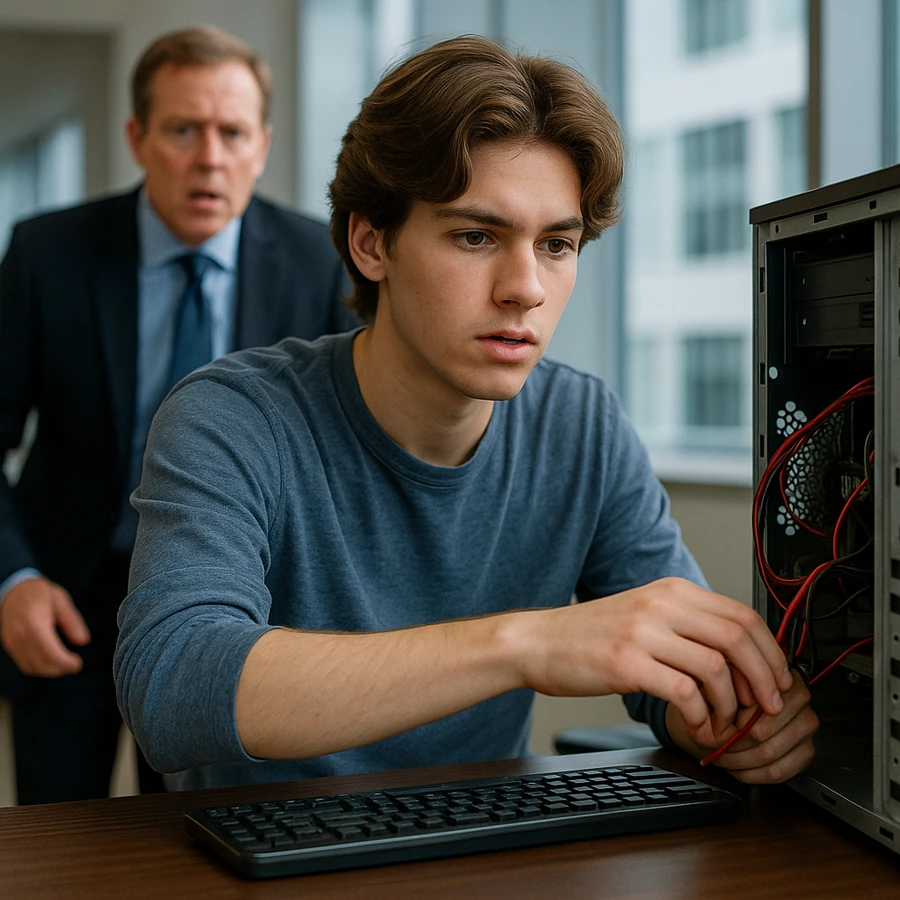 El CEO entró en pánico por una falla… y el hijo del conserje brilló