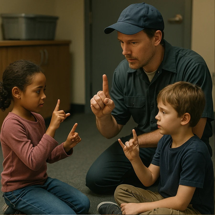 Robert estaba arrodillado frente a sus hijos, mostrando con paciencia cómo escribir la palabra “FAMILY” con las manos. Ava sonreía. Liam, concentrado, intentaba imitar los gestos.
