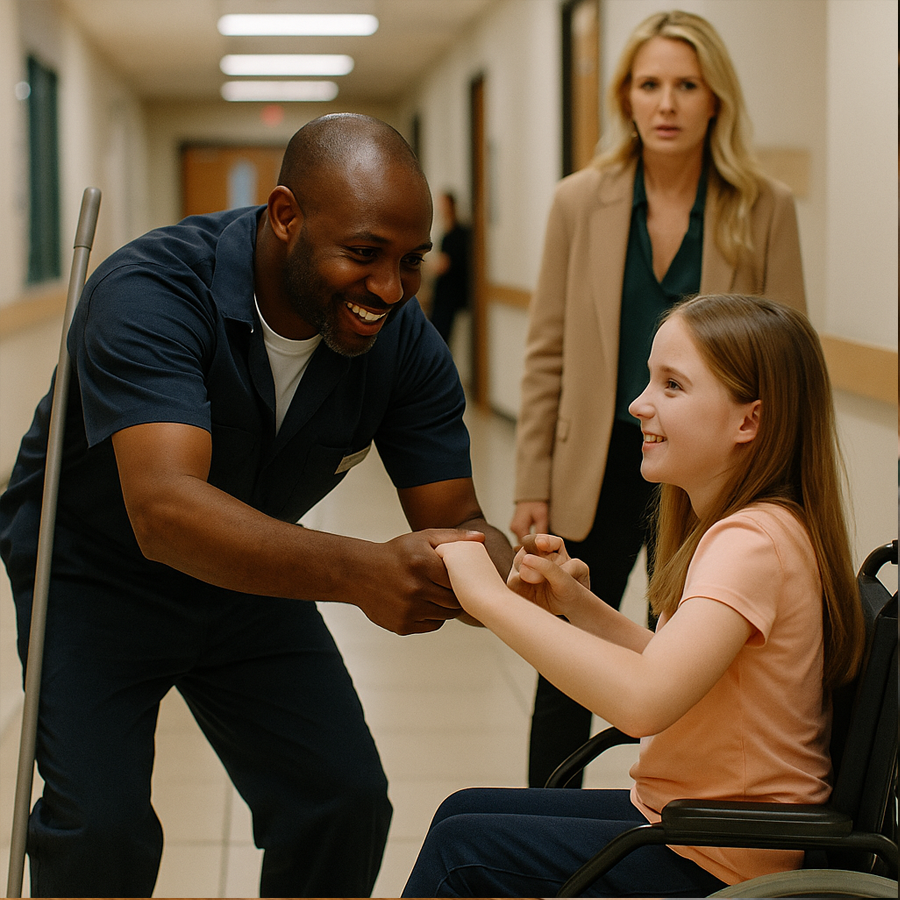 En un rincón del gimnasio, un hombre con uniforme azul estaba terminando de fregar el suelo. Su nombre era Marcus Hill, conserje y padre soltero de una niña de 7 años llamada Zoe. Trabajaba jornadas dobles para poder pagar los tratamientos médicos de su hija, diagnosticada con una discapacidad motora que la obligaba a usar una silla de ruedas.