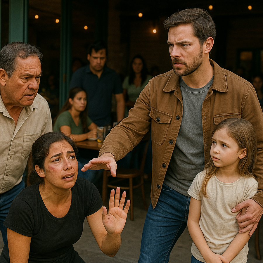 En ese instante, los hombres empujaron a la mujer contra la barra. El golpe hizo que varios vasos cayeran al suelo. El silencio se quebró. Sofía apretó la mano de su padre.