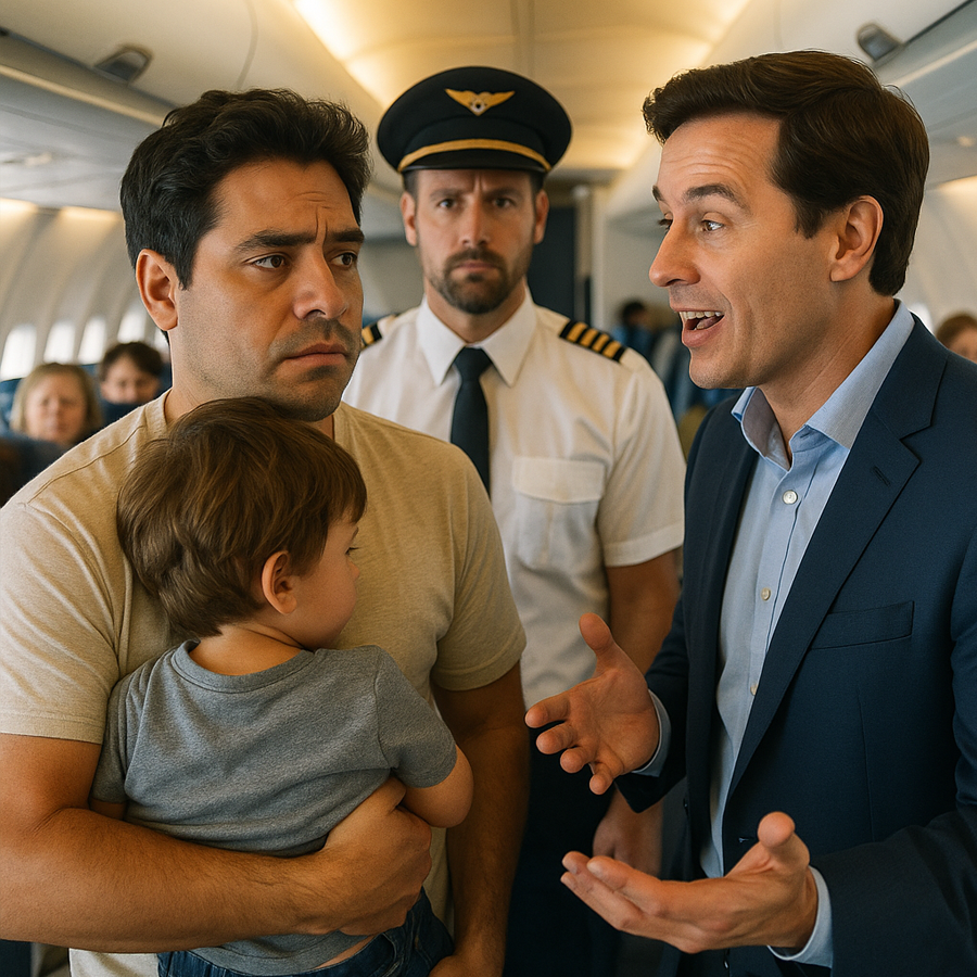 En el asiento 14B, un hombre de unos treinta y tantos años sostenía en brazos a su pequeño hijo dormido. Vestía ropa sencilla, una camiseta de algodón y jeans gastados. Su mirada, serena pero algo cansada, revelaba la historia de alguien acostumbrado a cargar responsabilidades más grandes que él mismo. Algunos pasajeros lo observaban con simpatía; otros, con indiferencia. Pero uno, en particular, lo miraba con desdén.