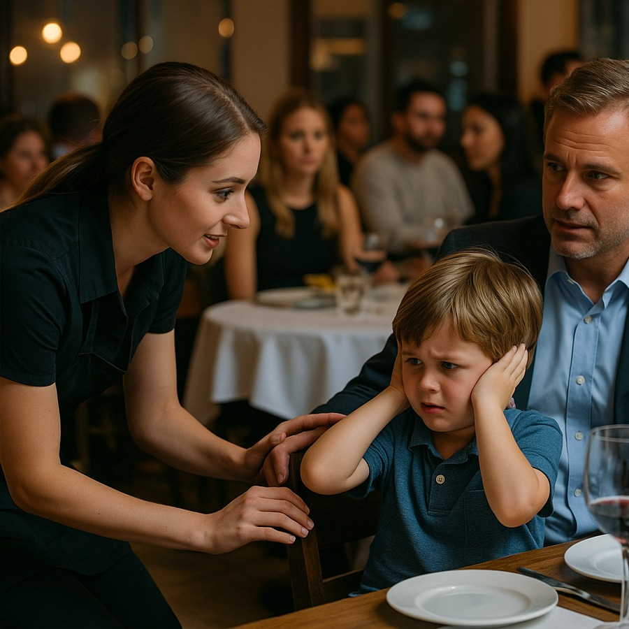 El niño temblaba, cubriéndose los oídos, incapaz de soportar el ruido y las miradas. Su madre lloraba en silencio. Y entonces, de entre las mesas, una figura apareció: una camarera de cabello oscuro y delantal azul.