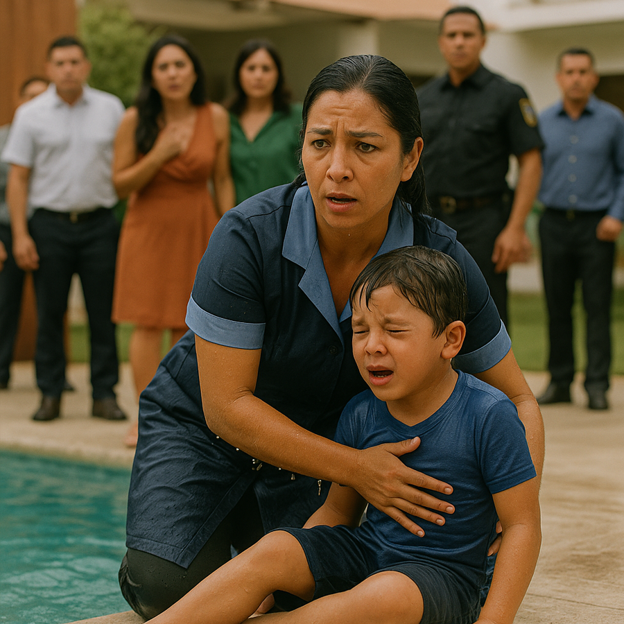 “El hijo del millonario cayó al agua ante la mirada paralizada de todos los presentes… pero solo una mujer, la misma trabajadora humillada horas antes por la familia, se lanzó sin dudar. Lo que pasó después no solo desató una ola de asombro, sino que reveló una verdad oculta que cambió para siempre el rumbo de aquella mansión.”