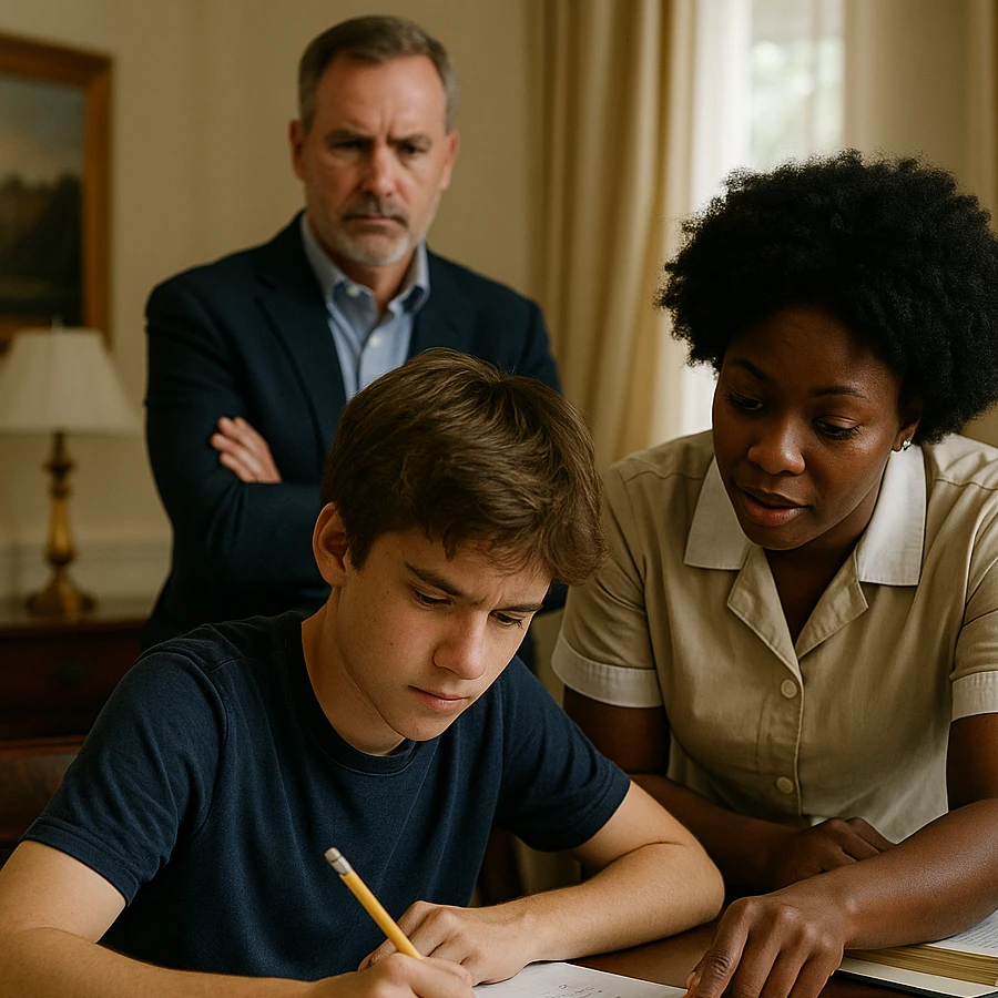 Roberto, al notar el cambio en su hijo, quiso saber qué ocurría. Una noche, observó en silencio desde la puerta cómo Grace enseñaba con paciencia mientras Martín reía al resolver un problema. La imagen lo dejó perplejo: aquella mujer, contratada para limpiar, estaba logrando lo que costosos tutores jamás habían conseguido.