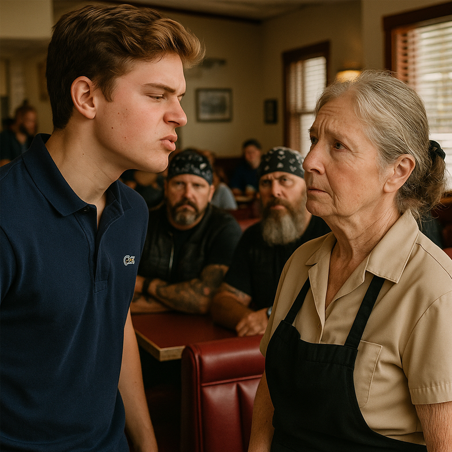 Aquel día, en un pequeño restaurante de carretera, una camarera anciana, un grupo de motociclistas y un chico arrogante demostraron que la bondad siempre encuentra la forma de poner a cada uno en su lugar.