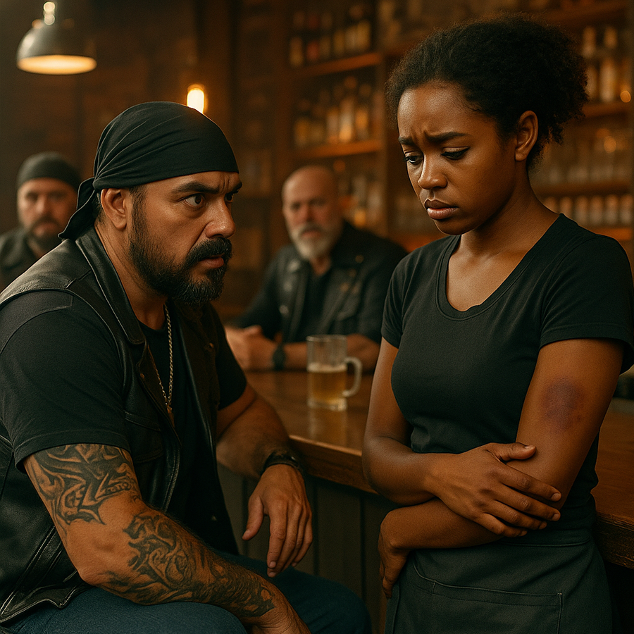 “El líder de una banda de motoqueros notó los moretones de la mesera y su reacción dejó a todos sin aliento: lo que parecía una simple noche de tragos se convirtió en una historia de justicia, valentía y redención que nadie esperaba. Detrás del cuero y las motocicletas se escondía un acto de humanidad que cambiaría la vida de una mujer y de todo el bar para siempre.”