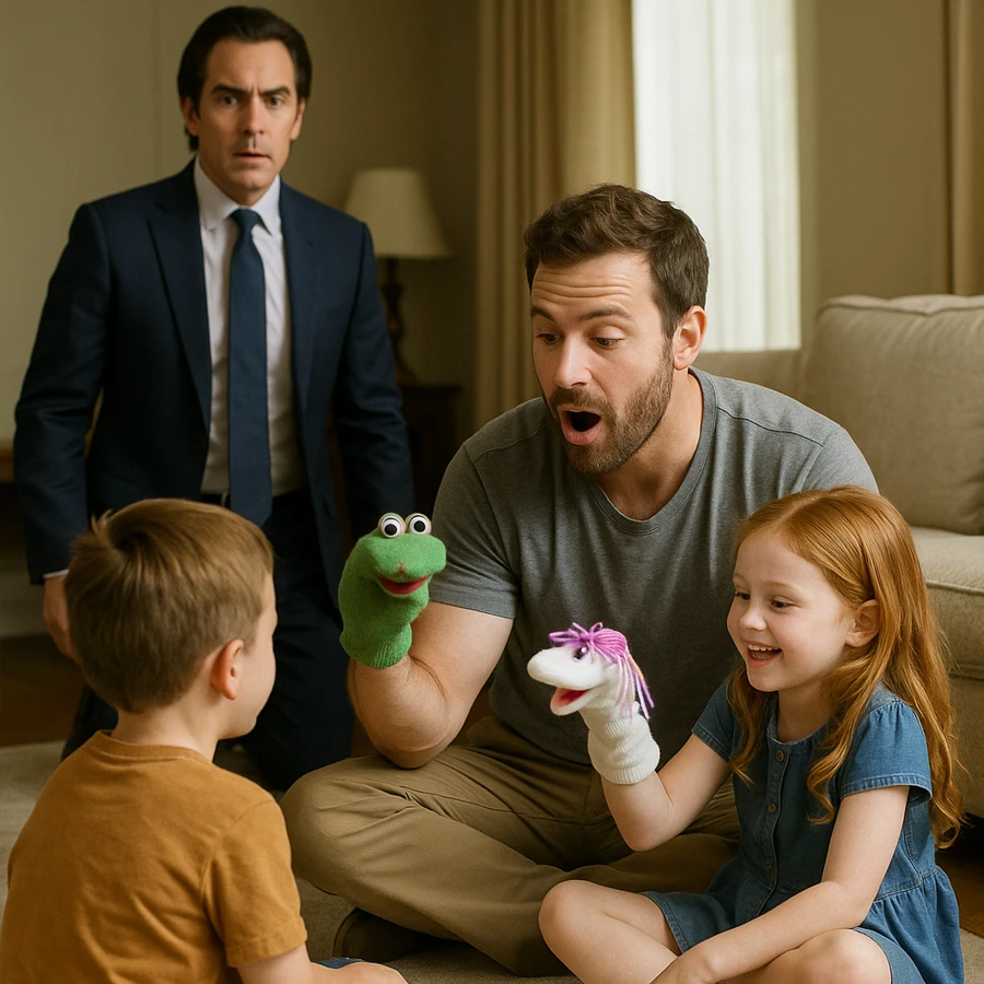 Al entrar en la mansión, escuchó risas provenientes del salón. Se acercó, intrigado. Lo que vio lo dejó inmóvil: Daniel estaba sentado en el suelo, junto a su hijo y la hija de Andrés, rodeados de cojines, jugando con marionetas hechas de calcetines viejos.