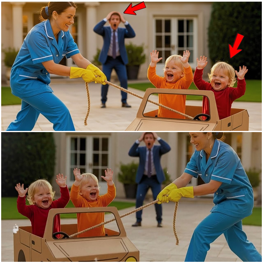 Cuando la niñera entró sorprendida, encontró la escena que nadie esperaba: los gemelos abrazando a su padre, los tres dentro de la caja, rodeados de juguetes simples y una felicidad imposible de comprar.
