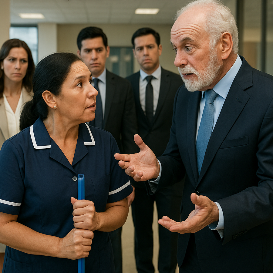 Mientras todos corrían de un lado a otro, ajustando detalles, alguien limpiaba discretamente las esquinas del salón de conferencias. Doña Isabel, la encargada de limpieza, llevaba quince años trabajando allí. Silenciosa, amable, y siempre con una sonrisa, era invisible para muchos, como suele ocurrir con quienes sostienen el orden sin pedir reconocimiento.