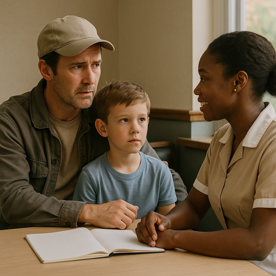 Camila lo abrazó, lo calmó y esperó con él hasta que Alejandro apareció, agitado.