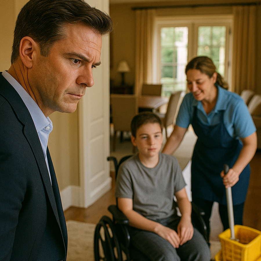 “El millonario que lo tenía todo descubrió un secreto inimaginable en su propia mansión: lo que la mujer de limpieza hacía con su hijo en silla de ruedas cambió su corazón y destruyó todo lo que creía sobre la compasión, el amor y el valor humano.”