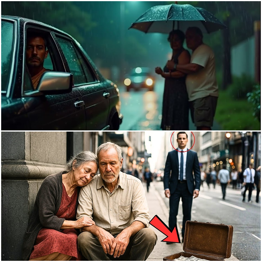 “El millonario que solo quería regresar a casa jamás imaginó lo que estaba a punto de vivir: al ver a una pareja de ancianos bajo la lluvia, decidió detenerse sin pensar… pero lo que encontró dentro del viejo maletín que ellos llevaban desató un misterio tan profundo e inesperado que terminó cambiando su vida para siempre”