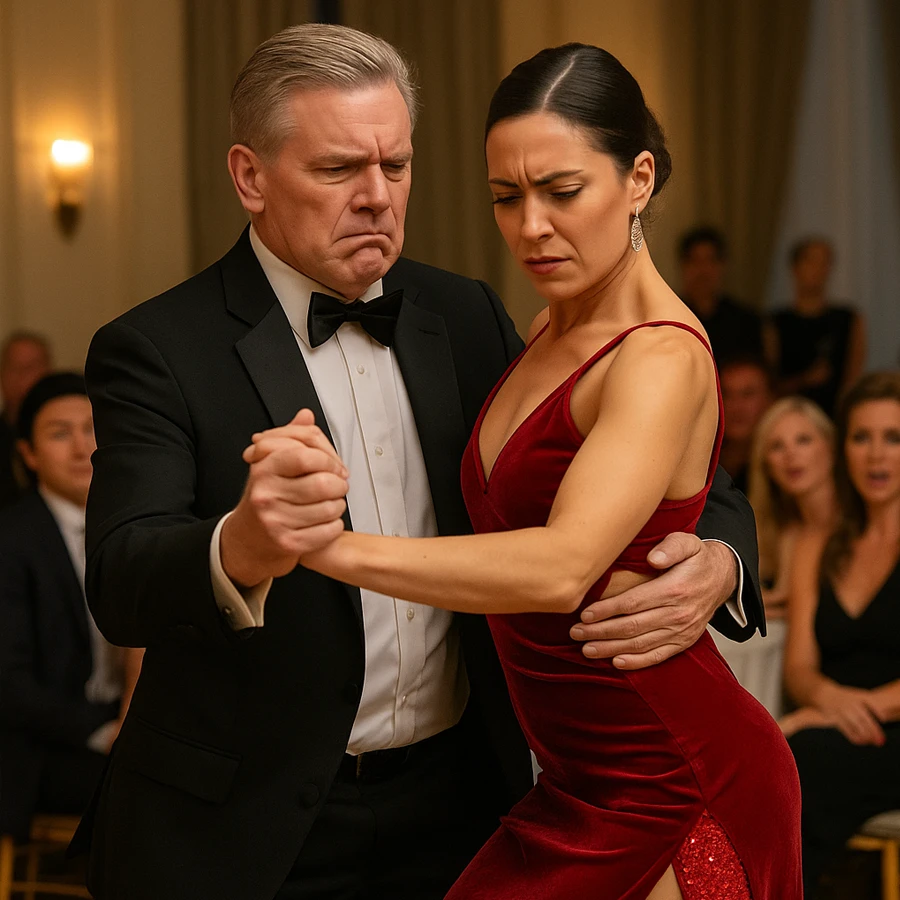 La música comenzó y todos rodearon la pista. Julián, confiado, trató de llevar los pasos con fuerza y exageración, creyendo que el tango era solo cuestión de actitud.