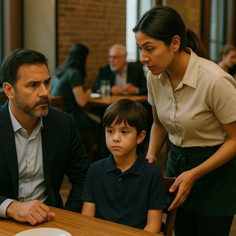 Marcelo se sentó en la mesa del fondo, junto a su hijo, Tomás, un niño de mirada triste que no decía una palabra. La camarera, Lucía Ramírez, se acercó con una sonrisa profesional.