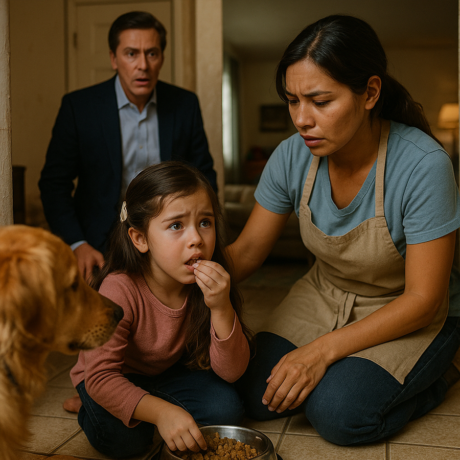 “El multimillonario pensó que lo había visto todo… hasta que una mañana, al entrar a la cocina, encontró a su hija pequeña comiendo del plato del perro. Lo que descubrió después lo dejó paralizado: una verdad tan dura y conmovedora que cambiaría para siempre su visión sobre la familia, el amor y el precio del descuido. Una historia que sacude el alma y muestra que ni el dinero puede reemplazar la presencia de un padre.”