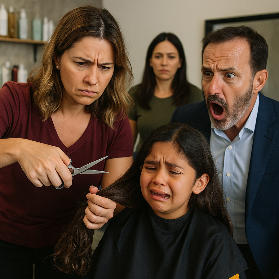 Era una tarde calurosa en una pequeña peluquería de barrio. Afuera, el ruido de los autos se mezclaba con la música de un puesto callejero. Dentro, una niña de apenas ocho años temblaba en la silla, mientras una mujer sostenía unas tijeras con impaciencia.