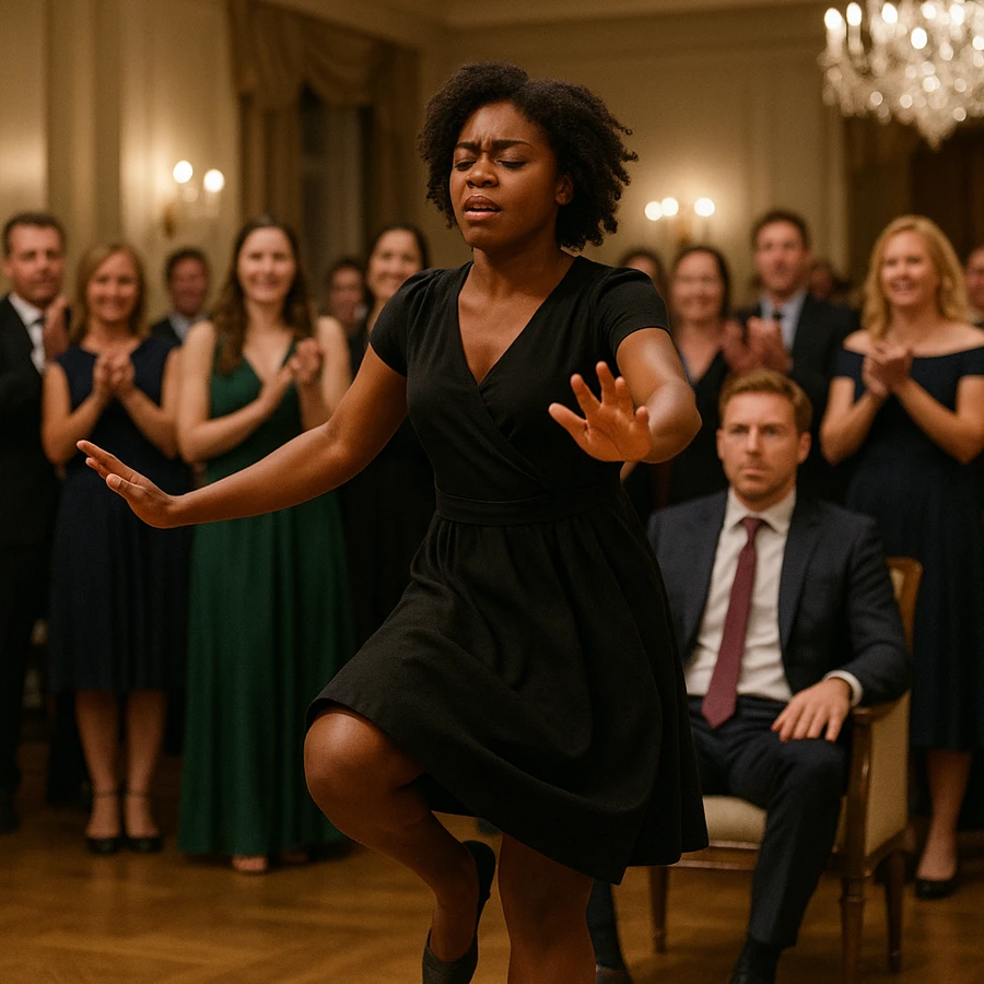 El salón entero se quedó mudo. La joven avanzó hacia el centro de la sala. La orquesta, confundida, comenzó a tocar tímidamente, y entonces ocurrió lo impensado: la mujer comenzó a bailar.