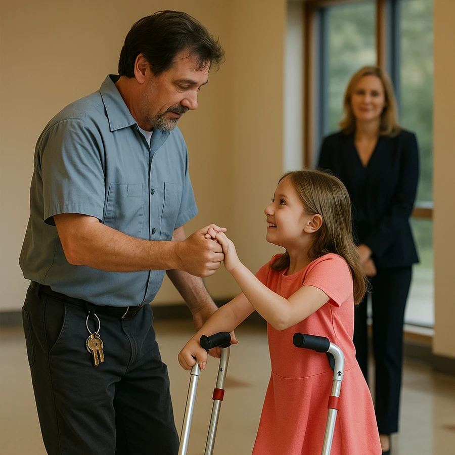 El conserje de la escuela, un hombre humilde y papá soltero, llevaba años trabajando allí. Todos lo conocían por su amabilidad, aunque casi nadie prestaba atención a su vida personal. Esa noche, mientras barría un pasillo cercano, notó la mirada apagada de la niña. Sonrió, dejó a un lado el trapeador y se acercó con paso seguro.