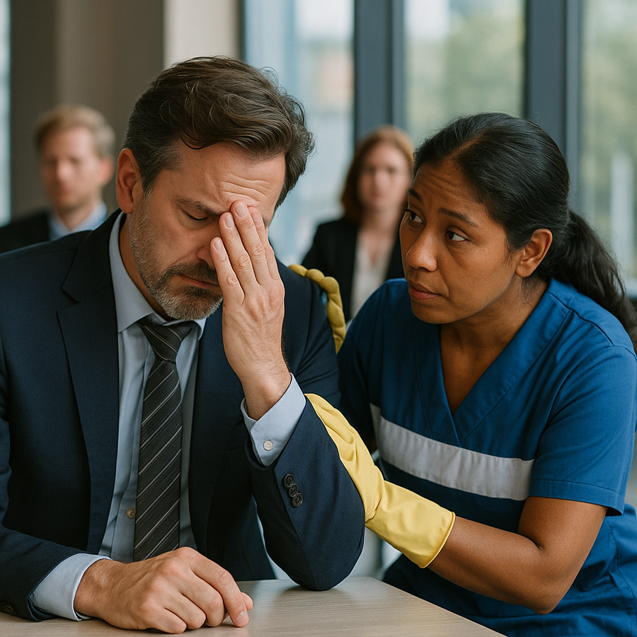 A diferencia de los demás, ella nunca le preguntó por su caída. Simplemente hacía su trabajo en silencio, limpiando el suelo con la misma dedicación con que él solía firmar contratos millonarios.