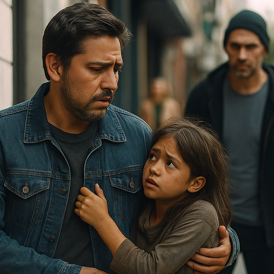 Al mirar hacia la calle, Leonardo vio a un individuo alto, con gorra y mirada amenazante, que se acercaba lentamente. Sin pensarlo dos veces, rodeó a la niña con su brazo.