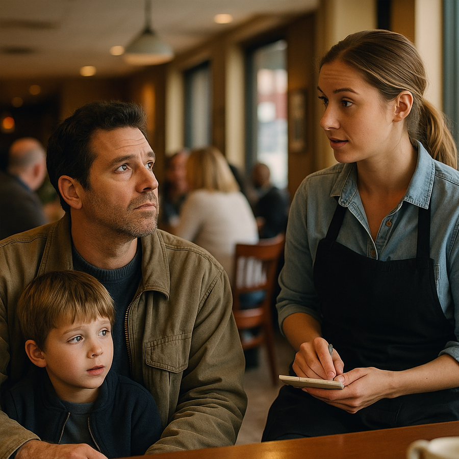 En una pequeña cafetería de Chicago, donde el aroma del café se mezcla con las risas de los clientes, un hombre de aspecto sencillo entró de la mano de su hijo.
