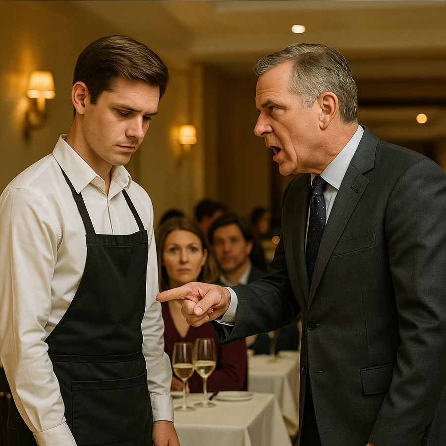 La historia comenzó en una tarde concurrida, cuando el restaurante estaba lleno de clientes de alto perfil. El gerente, conocido por su carácter altanero y sus frecuentes desplantes de superioridad, notó un pequeño error en el servicio del joven camarero: un vaso mal colocado y un pedido entregado con dos minutos de retraso. Aunque la situación era mínima, el gerente decidió usarla como excusa para humillar al muchacho frente a todos.