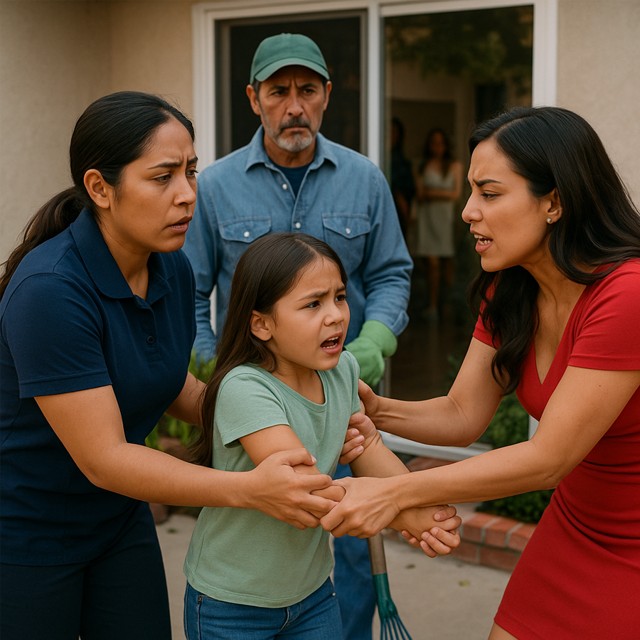 Regina sostenía del brazo a Sofía, intentando arrastrarla hacia la casa con evidente desesperación. La niña lloraba.