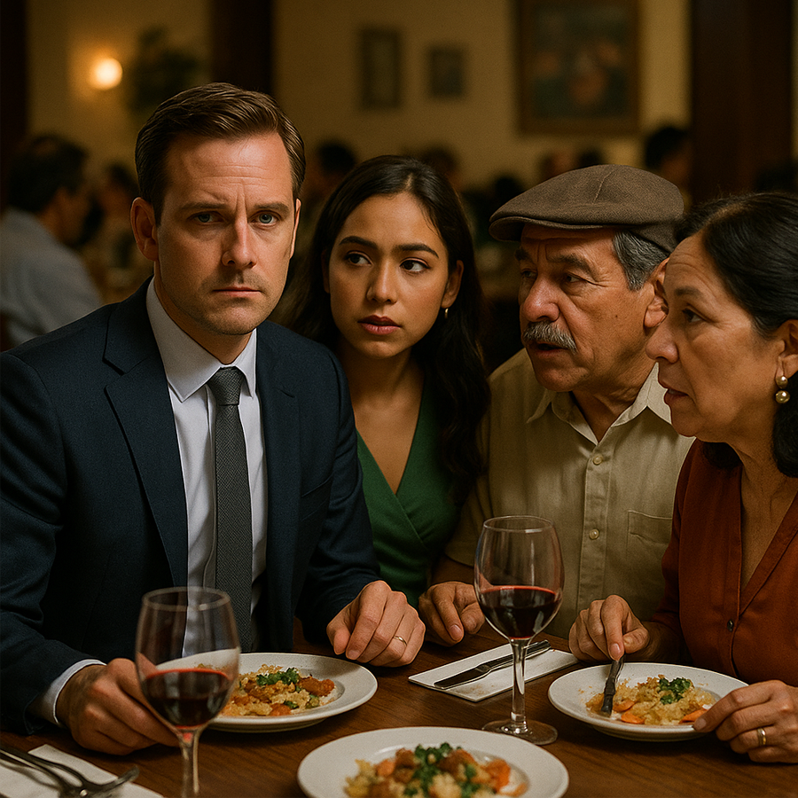 Mientras los platos principales llegaban, el ambiente se volvió aún más extraño. Los padres parecían discutir algo con urgencia, inclinándose hacia adelante para intercambiar palabras en ese idioma impenetrable, sin mirar al futuro yerno. La prometida, cada vez más nerviosa, comenzaba a mostrar señales evidentes de preocupación. Su postura rígida, sus manos inquietas y el modo en que apretaba los labios delataban que algo importante estaba sucediendo.