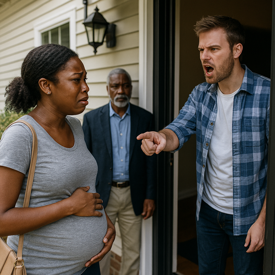Era una tarde nublada en las afueras de Atlanta, en un vecindario tranquilo de casas idénticas y céspedes perfectamente recortados. Amanda Johnson, una joven mujer afroamericana embarazada de siete meses, sostenía una pequeña maleta junto a la puerta. Su rostro reflejaba miedo, cansancio y algo de dignidad. Frente a ella, su esposo, Brian Miller, un hombre blanco de 34 años, gritaba sin contener la furia.