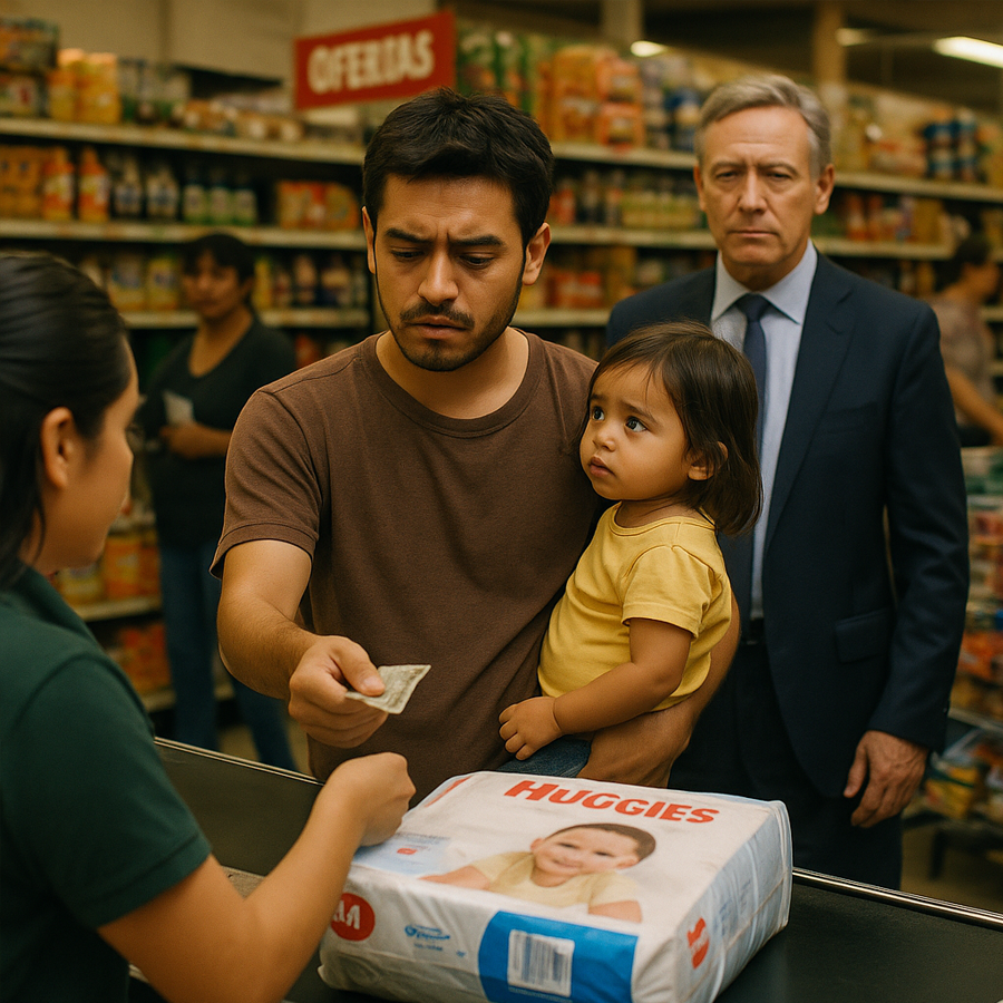 Mientras Diego avanzaba hacia la línea de cajas, no pudo evitar sentirse avergonzado. A su alrededor, otros clientes llenaban carritos enteros: carnes caras, frutas importadas, bebidas costosas, productos de limpieza, cajas de cereal. Él solo llevaba pañales.