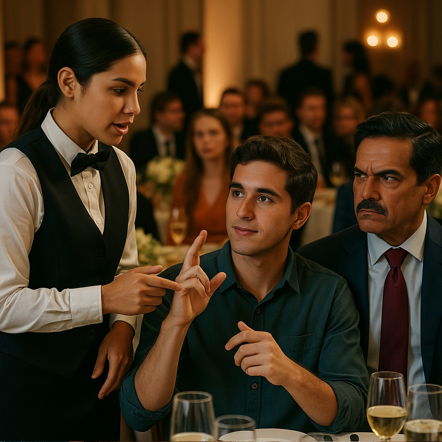 Mientras los invitados conversaban y disfrutaban del ambiente festivo, los camareros se movían con precisión entre las mesas. Entre ellos se encontraba Amalia, una joven mexicana que trabajaba en el hotel desde hacía apenas seis meses. Su habilidad para mantener la calma incluso en los momentos más caóticos la había convertido en una de las preferidas por los clientes. Lo que pocos sabían era que Amalia, además de su excelente desempeño, dominaba la Lengua de Señas desde la adolescencia.