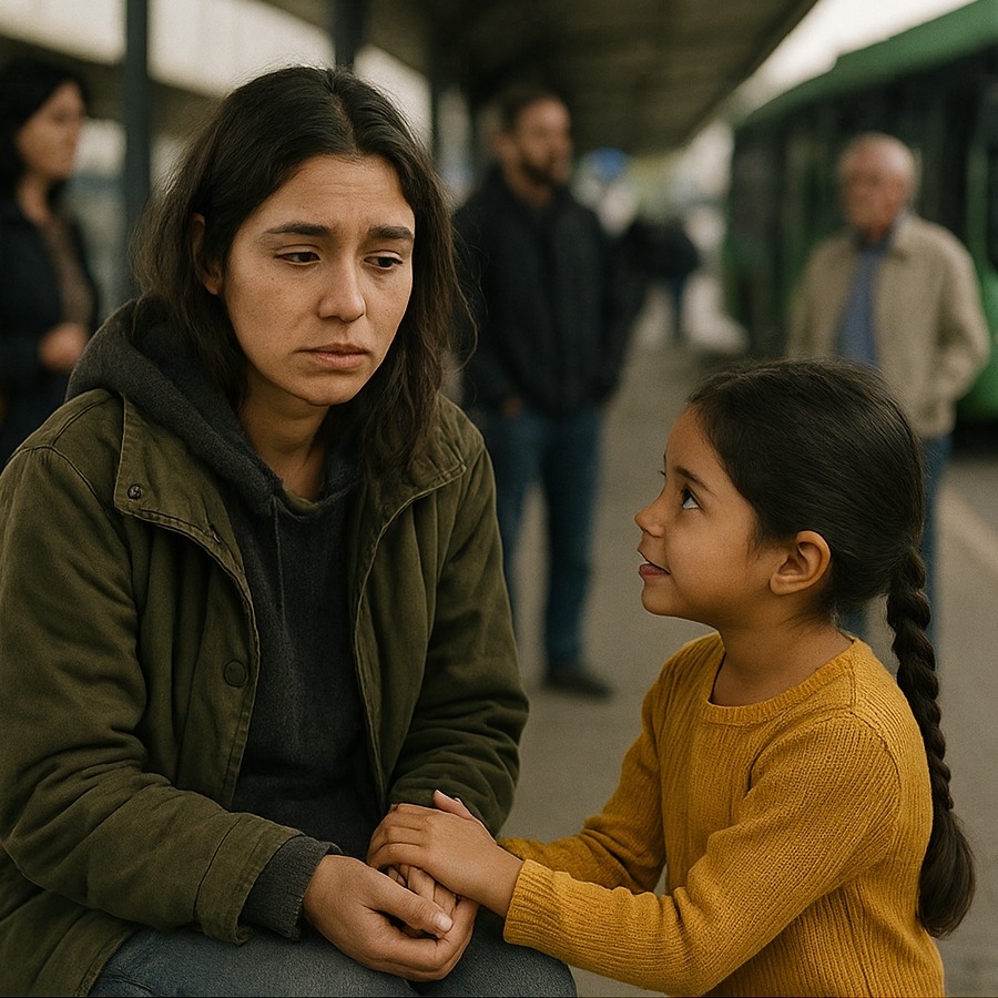 Bajo el cielo gris de la ciudad, entre el ruido de los motores y el ir y venir de las personas apuradas por llegar a sus destinos, una pequeña de seis años llamada Lucía notó algo que otros preferían no mirar: una joven mujer sentada en un banco, con la mirada perdida y una manta vieja sobre las rodillas. Tenía el cabello oscuro, los ojos cansados y una expresión que combinaba tristeza con resignación.