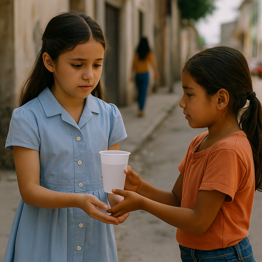 A pocos pasos, una niña de su misma edad —ropa sencilla, cabello trenzado y manos manchadas de tierra— se le acercó con una sonrisa.