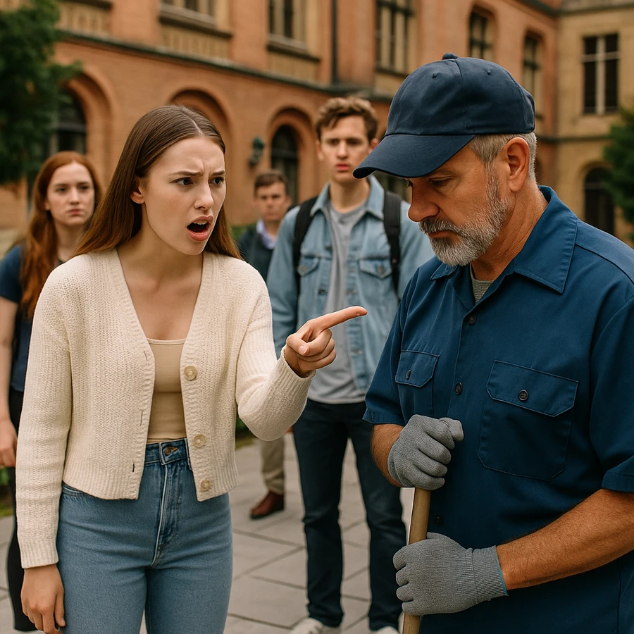 Valeria Márquez, hija de un magnate del sector inmobiliario, era conocida por su carácter altivo y sus desplantes hacia quienes consideraba “inferiores”. Una mañana, al llegar a clase, vio a un hombre de uniforme azul limpiando el pasillo. Sin importarle la mirada de los demás, soltó con desprecio: