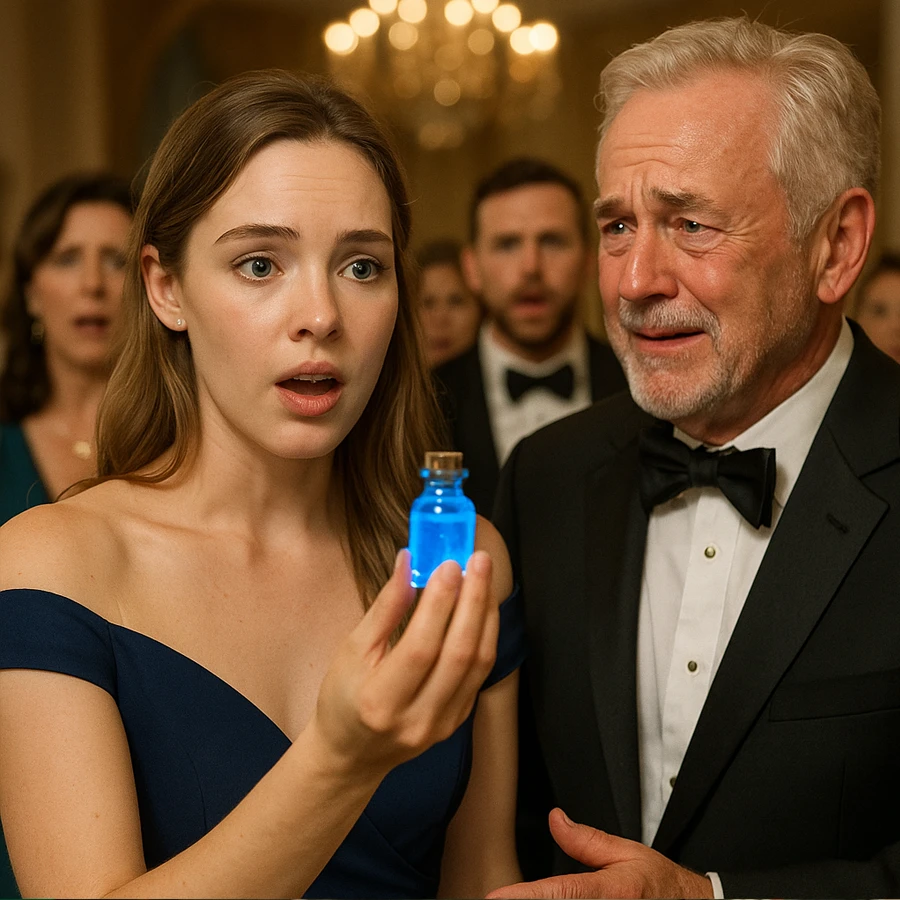 Todo cambió una noche de gala en la mansión. Mientras los invitados disfrutaban de la música y el champán, un hombre extraño apareció entre los camareros. Llevaba una pequeña botella de cristal con un líquido brillante, azul intenso, y se la entregó discretamente a la joven.