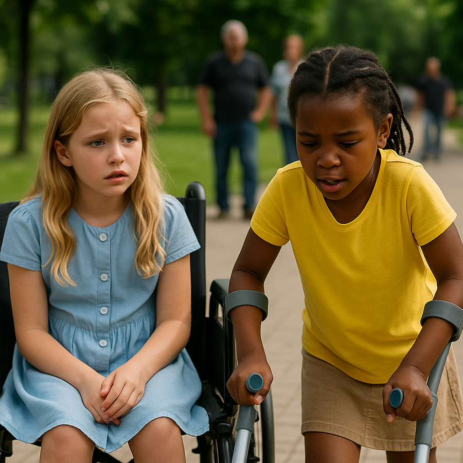 De pronto, la atención de la niña se desvió hacia un rincón del parque. Allí, una niña de su edad, de piel morena y camiseta desgastada, luchaba por mantenerse en pie con la ayuda de dos muletas. Cada paso que daba era un desafío, pero en su rostro no había dolor, sino determinación.