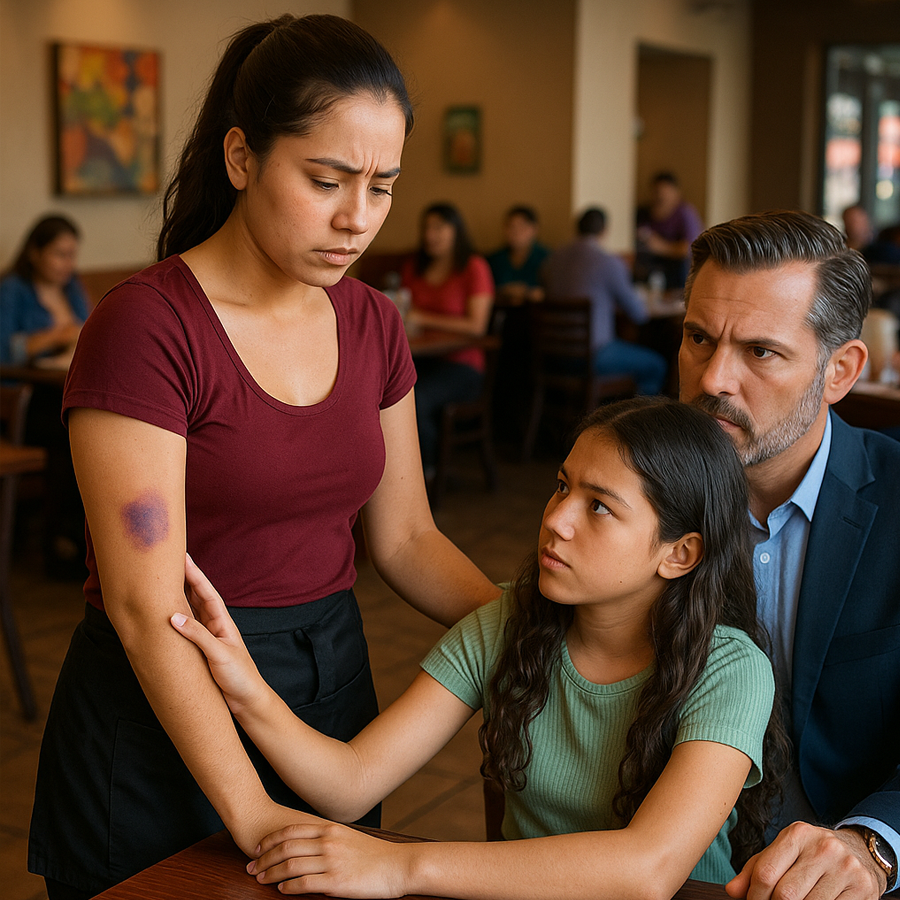 “La hija del millonario notó los moretones de la mesera… y lo que hizo después dejó al restaurante en silencio: un gesto que reveló una verdad oscura y cambió la vida de todos los presentes”