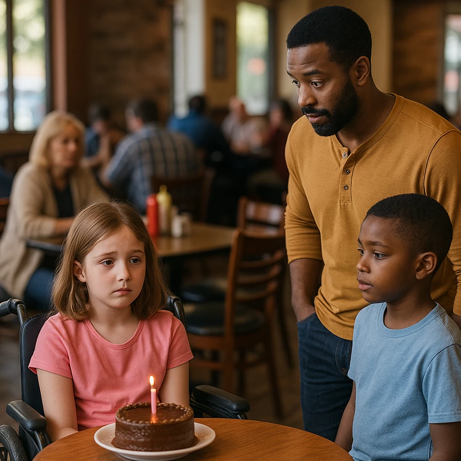 Al ver a la niña sola frente al pastel, el hombre se detuvo. Su hijo lo miró con ojos de duda y él, con una sonrisa cálida, se inclinó y le susurró: