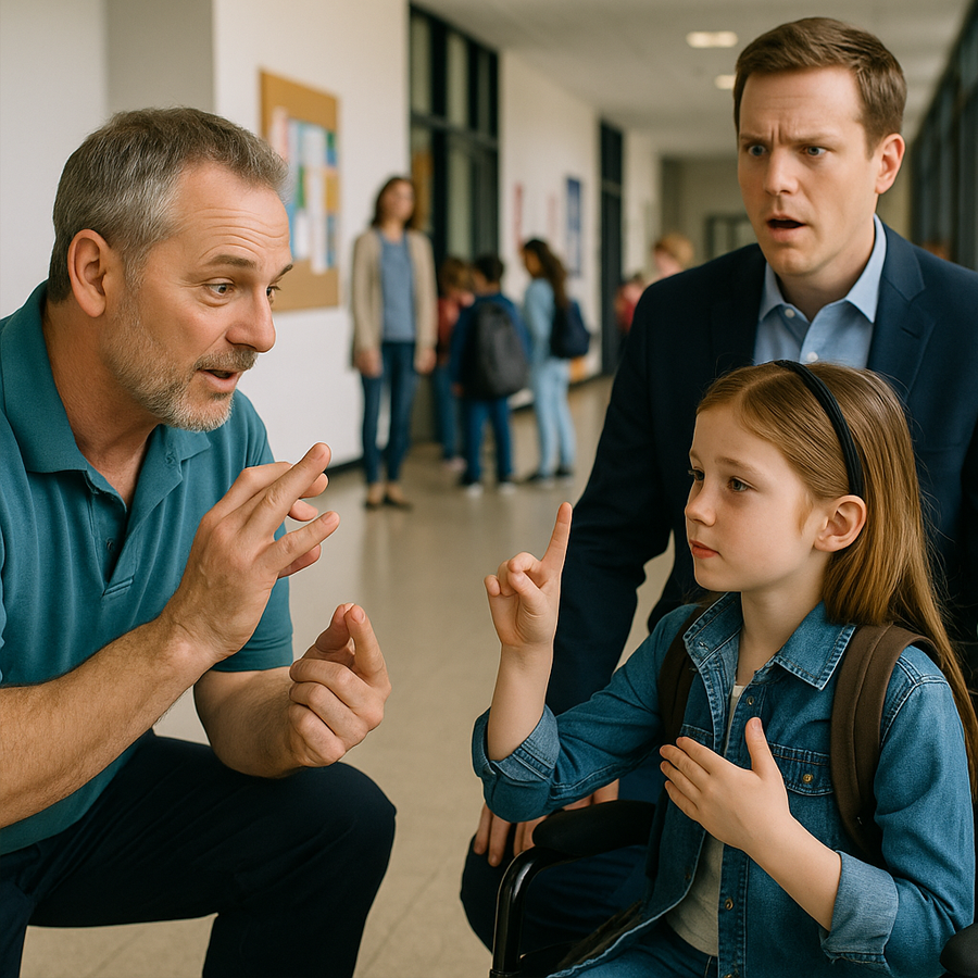 Desde entonces, cada vez que el conserje tenía un momento libre, se comunicaba con la niña. Le contaba chistes, le enseñaba palabras nuevas, y hasta compartían historias. Los demás estudiantes, al verlos, comenzaron a interesarse en el lenguaje de señas. Poco a poco, algunos se unieron, repitiendo los gestos torpemente, pero con ganas de incluirla.