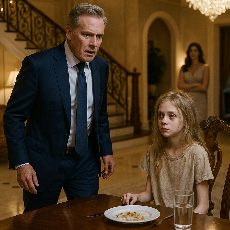 Laura apareció en el umbral, impecable en su vestido de seda marfil. Su sonrisa no alcanzaba sus ojos. «¿Has vuelto antes de lo previsto?», preguntó. «Sí», dijo él, con voz firme. «Y veo que algo anda mal». Laura bajó la cabeza y sus labios temblaron por un instante. «Bueno… Isabella tiene un apetito delicado últimamente», murmuró. Él se acercó, levantó el plato vacío en la mesa de la cocina, lo observó y lo alzó. «¿Delicado? Esto está vacío». La voz de David retumbó en el silencio.