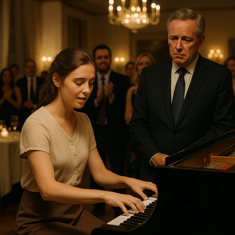 Los invitados rieron. Algunos cuchicheaban, otros esperaban el espectáculo con morbosa expectación. La joven dudó. Su respiración se aceleró. Pero entonces, en silencio, se acercó al piano, alisó su vestido sencillo y se sentó frente al teclado.