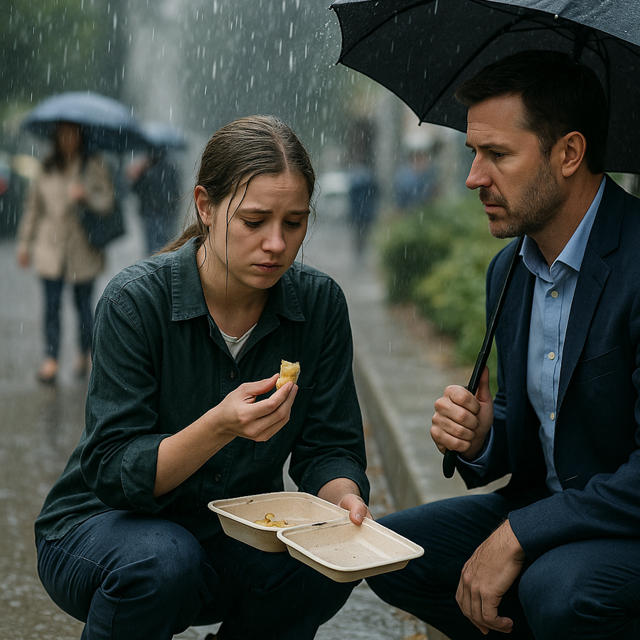 La vio comer bajo la lluvia… y lo que descubrió lo hizo llorar