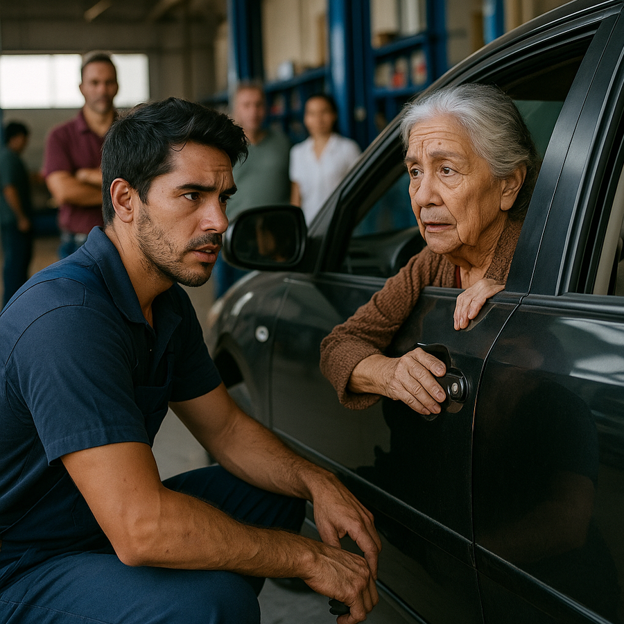 Frente al taller, un coche viejo se detuvo haciendo un ruido extraño. Del vehículo bajó una mujer mayor, de unos 70 años, con cabello blanco y un abrigo gastado.
