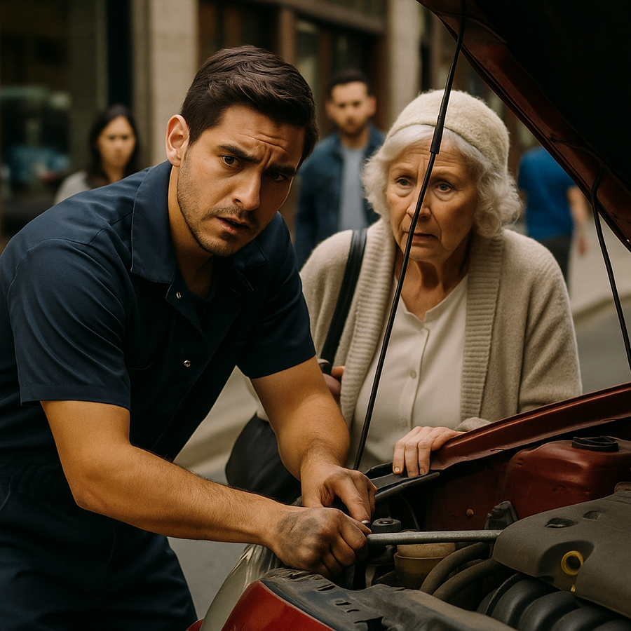 A media mañana, una mujer mayor estacionó un coche antiguo frente al taller. Se notaba nerviosa, bajó lentamente y, con voz temblorosa, dijo: